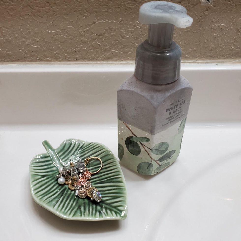 I recently added a dish in my bathroom to place my daily jewelry on at the end of the day and it has made keeping track of all those items a lot easier. This decorative leaf dish is a simple one that you could place on your nightstand or in the bathroom to hold small items.