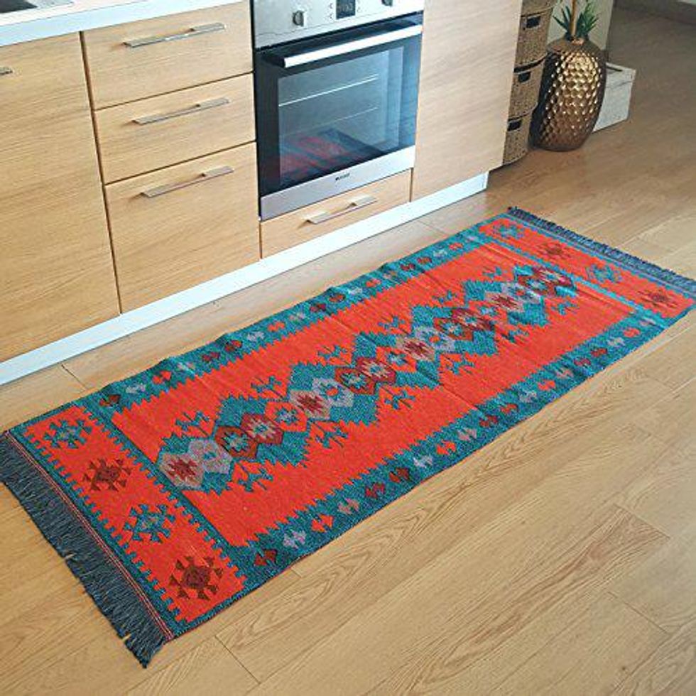 I love the look of a runner rug in the kitchen to brighten up the tile or wood floor. Any room can really just benefit from the softness a nice rug can bring. And this brightly colored rug gives that great, bold pop of color!