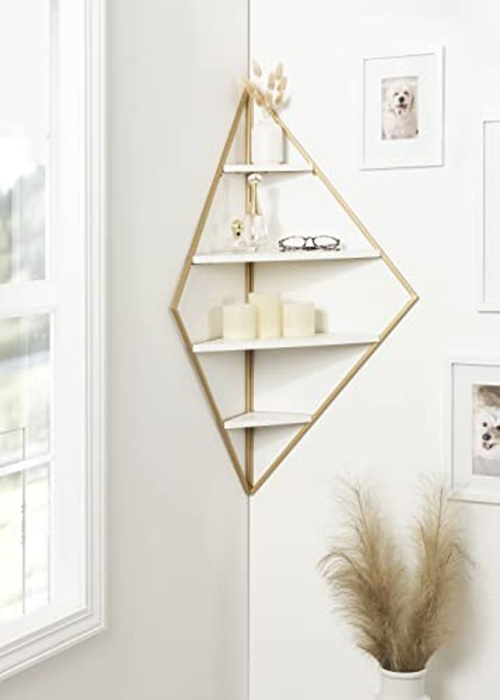 Kate & Laurel's Melora Corner Shelf "features a unique, dimensional design that emerges from the wall toward viewers." When I first saw the Melora Corner Shelf, it immediately stood out to me. The diamond shape has four tiers of shelving and high-quality finishes. It attaches to the wall with eyelet hangers.