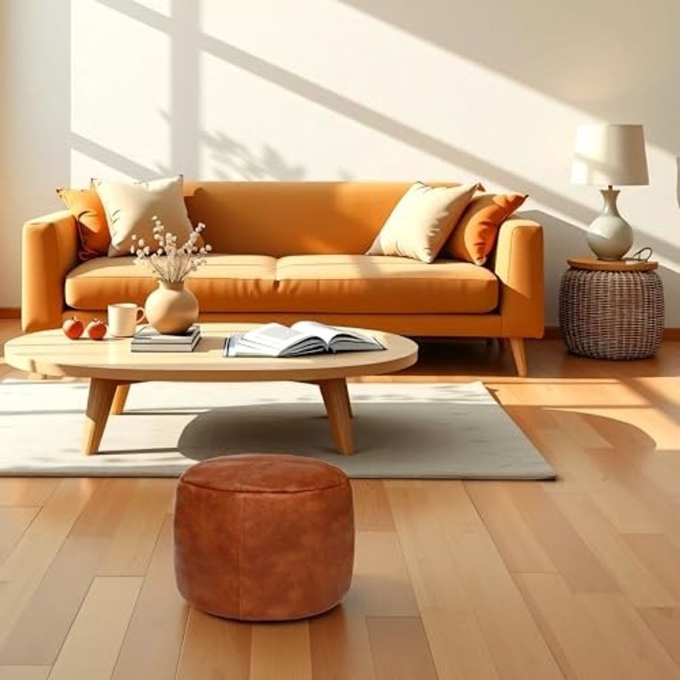 With its warm amaretto hue and supple faux leather texture, this handmade pouf brings an earthy richness to a moody, lounge-inspired space. Perfect as a footrest, casual seat, or layered accent, it adds a touch of understated luxury and vintage character to the look.