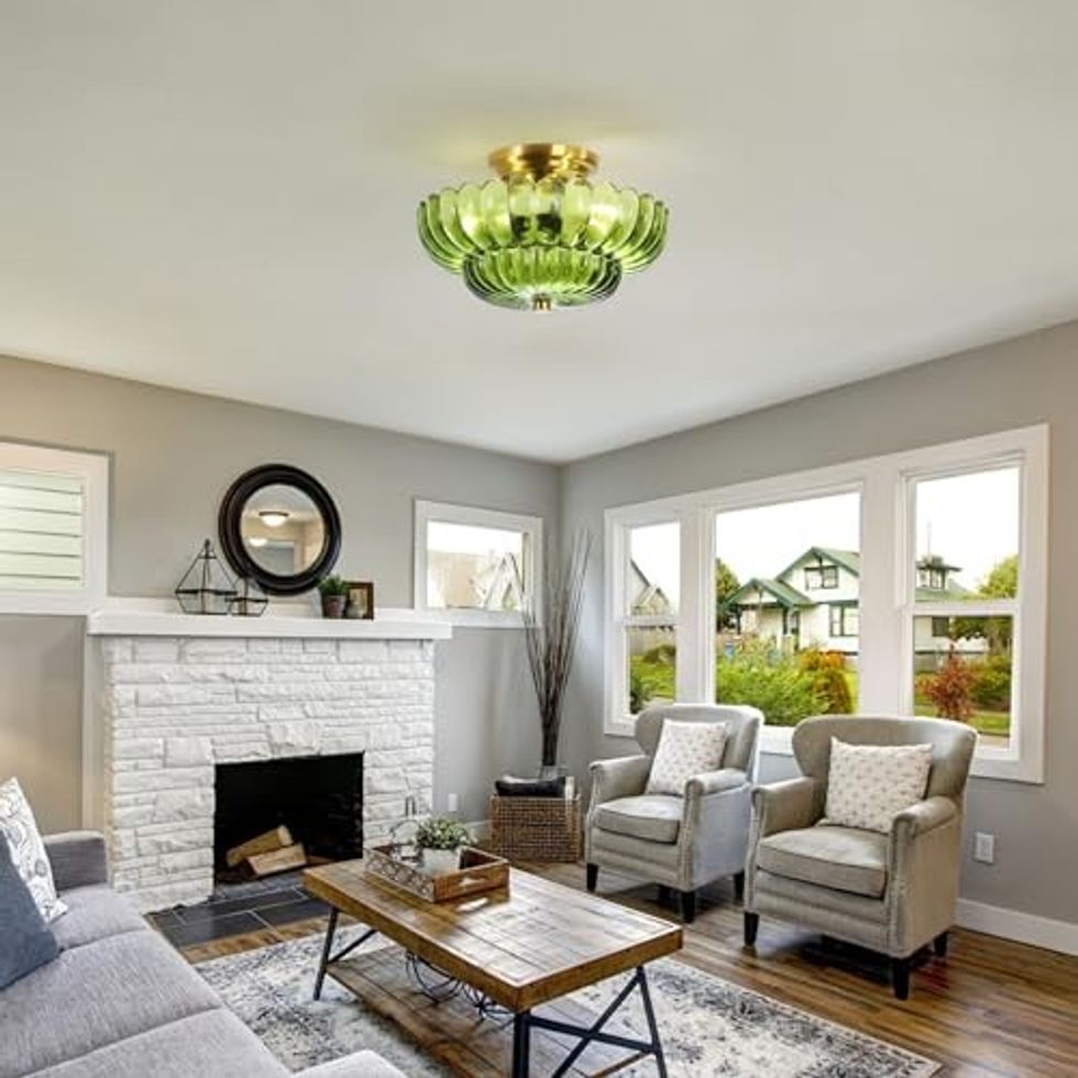With its brushed brass finish and rich green glass, this flush mount fixture brings a bold yet refined glow to any room. The modern silhouette paired with vintage-inspired color makes it an ideal statement piece.