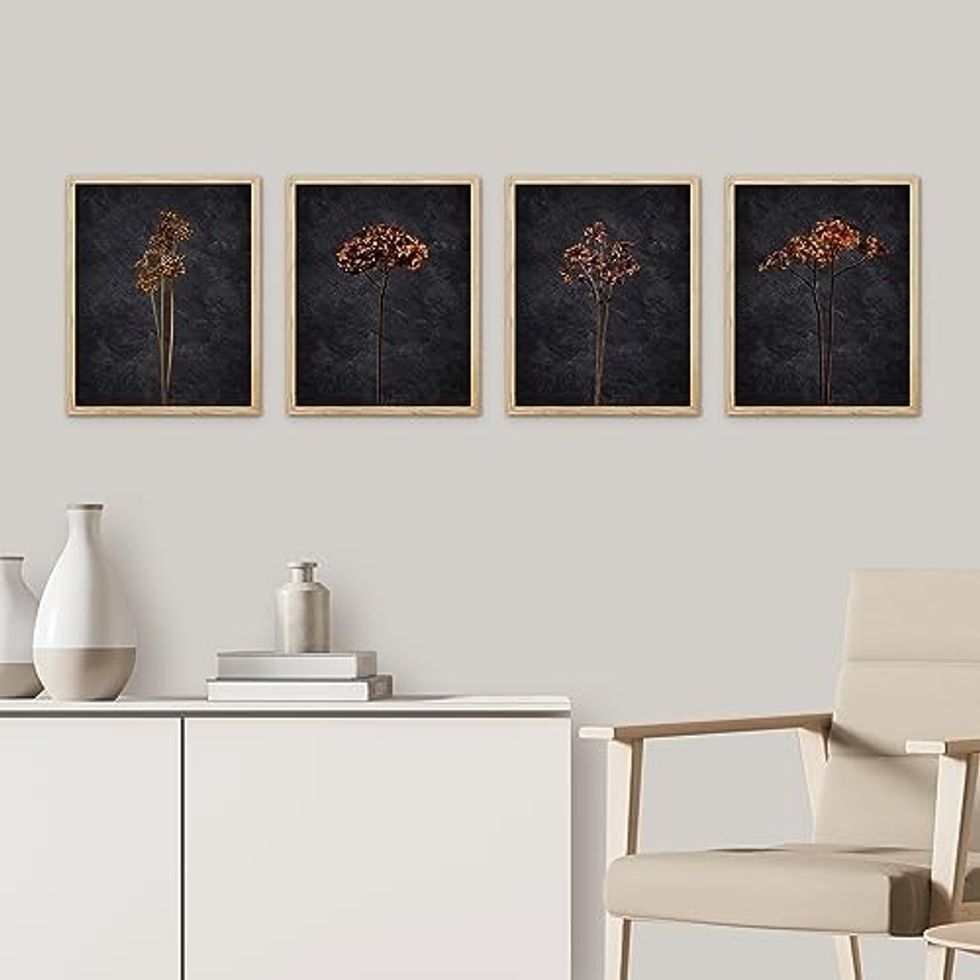 Dark, textural, and artfully restrained, this set of moody floral prints adds quiet drama to a space. The deep orange tones and minimalistic composition layer well, offering a sophisticated way to introduce color and softness without sacrificing a rich, atmospheric mood.
