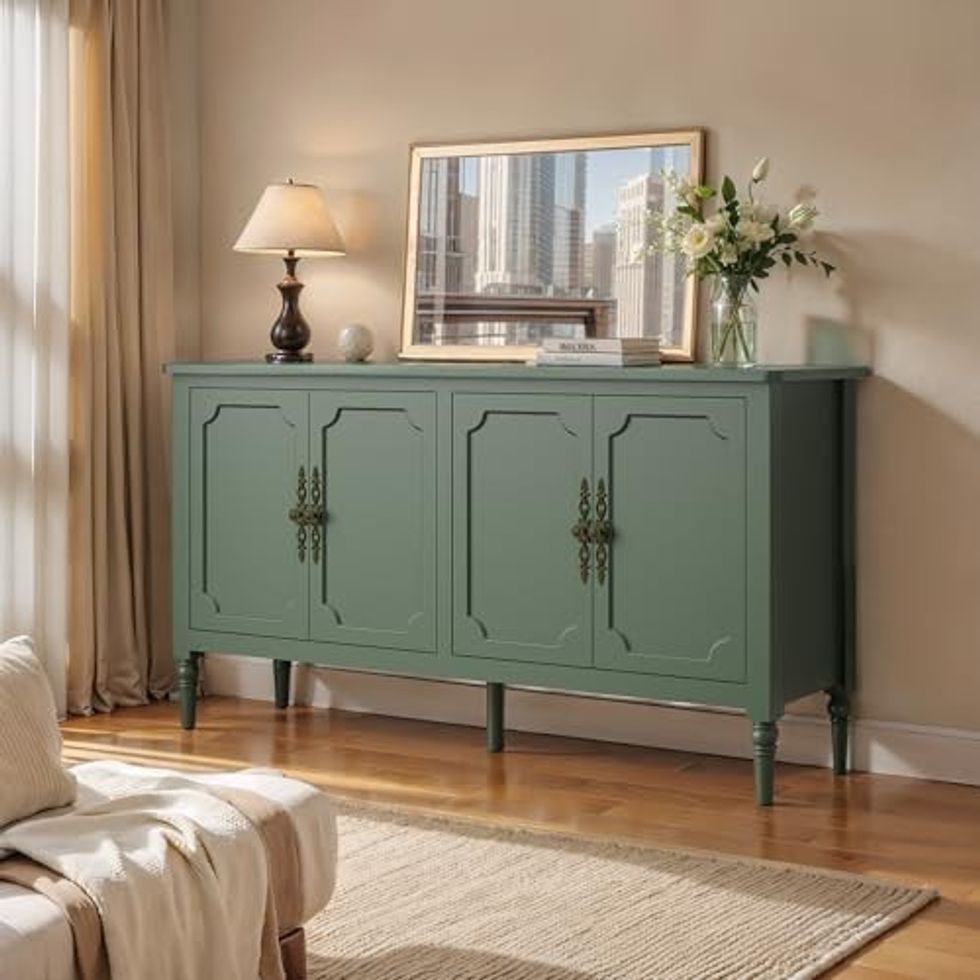 With its bold forest green finish, vintage lines, and solid wood legs, this sideboard strikes the perfect balance between statement and sophistication. Its rich tone and versatile storage make it a natural anchor in your dining space.