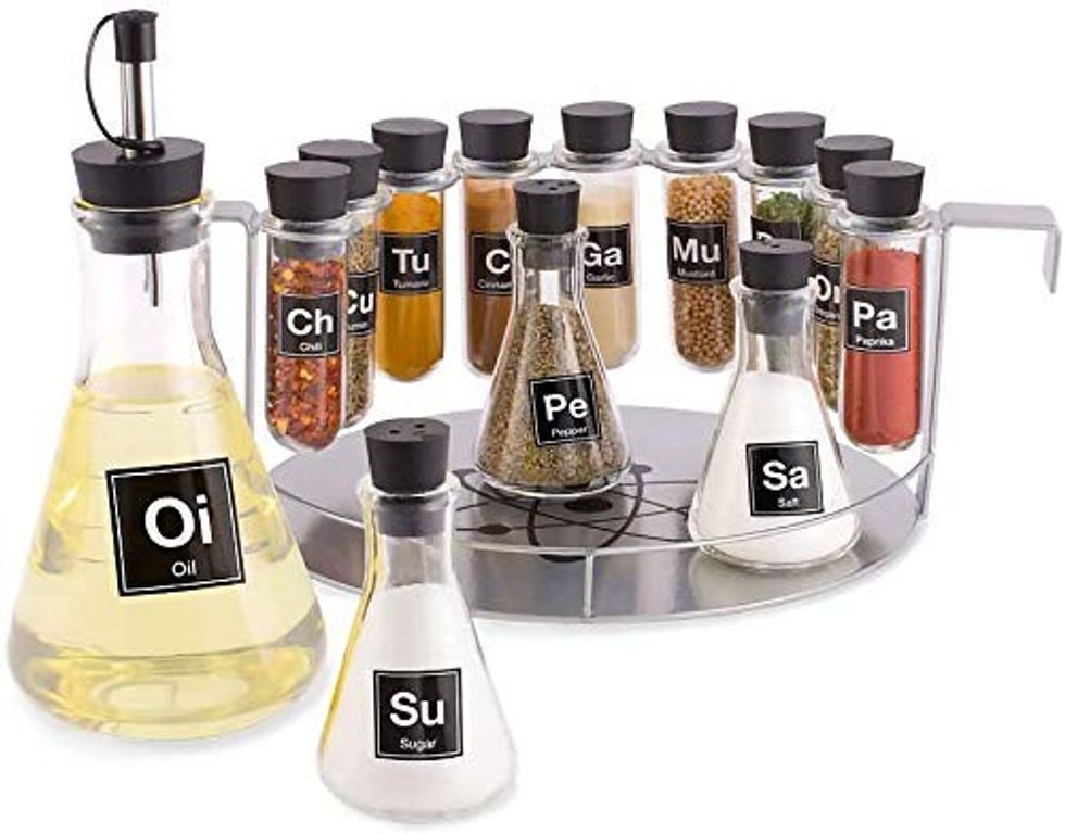 Do you love experimenting with new recipes in the lab and in the kitchen? Then this spice rack set is perfect for you. Featuring nine test tubes, three lab flasks, a large flask for oil, and a metal rack, it's a fun and unique way to store your spices. The set even comes with some labels, so you can choose which spices go in which test tubes. With its scientific design, this spice rack set is sure to impress any nerdy foodie.