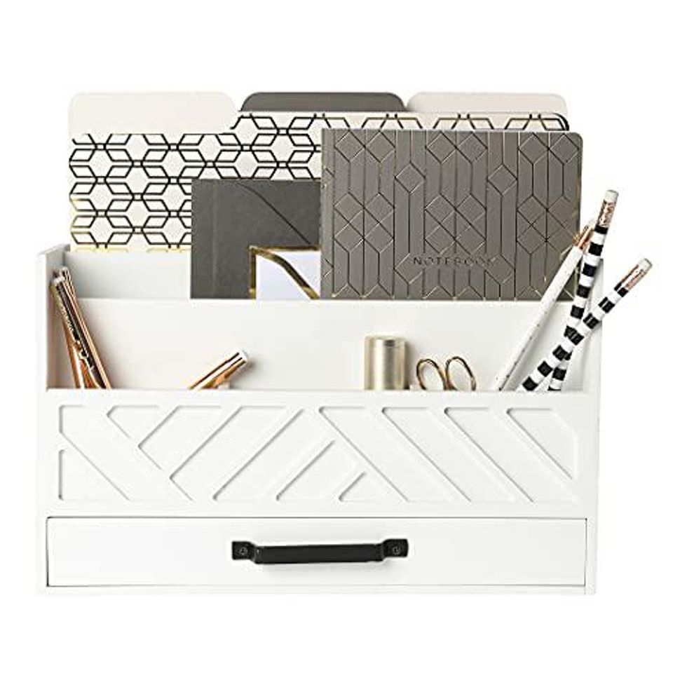 I love an item that is versatile, so it's no surprise that I'm head over heels for this mail organizer. It would work beautifully in an entryway, a kitchen, or an office. With multiple slots for papers, notebooks, or pens, plus a small drawer for the things you like tucked away, it's surprisingly spacious. And that doesn't even touch on the patterning that mirrors molding. It's got a classic, classy feel to it that I want for all my spaces.