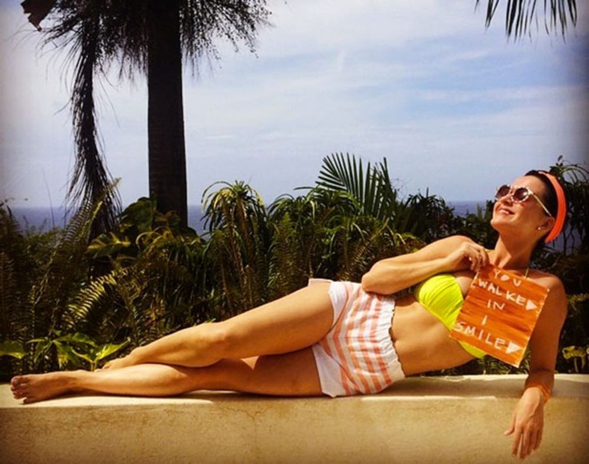 4. Katy Perry: Dressed head to hip in the colors of a tropical sunset, Katy models her vintage-inspired beach outfit while she catches some rays (+ makes US smile) in her palm tree paradise.