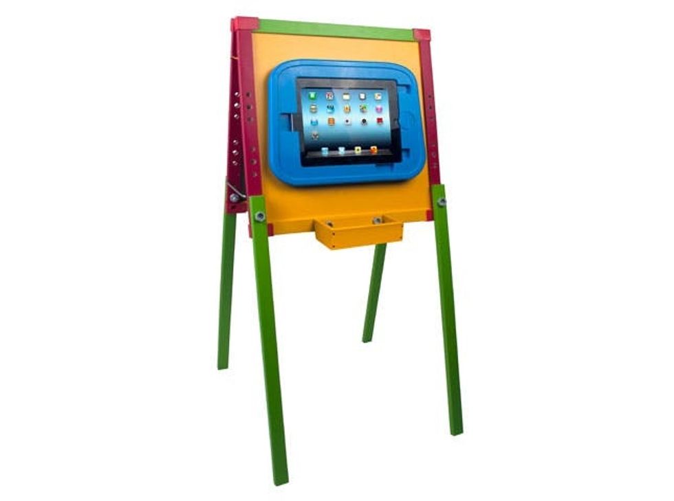 1. iPad Easel (in production): First up, the iPad Easel. This art-inspired stand comes complete with conductive art supplies making it fun and easy for kids to play around with, and the back is a dry-erase board for more analog creations.
