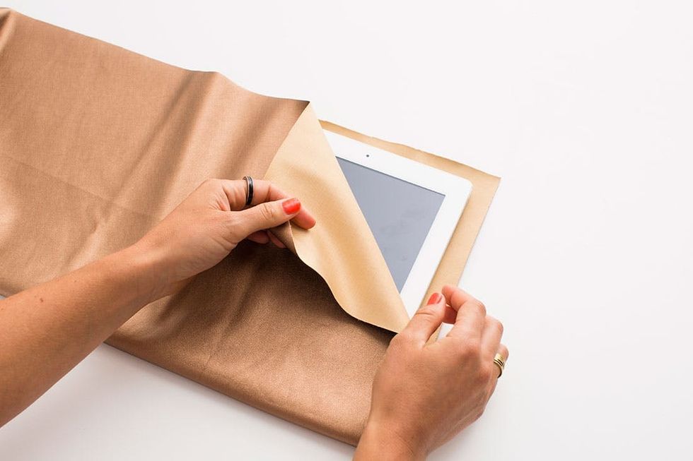 1. Measure your fabric by folding your leather over your iPad or laptop (we’re demonstrating with an iPad) with the folded end at the bottom.