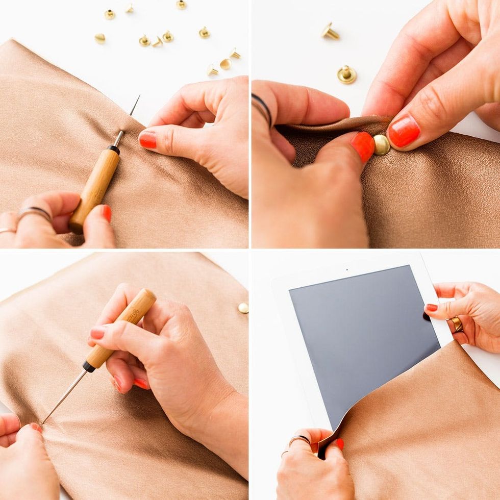 3. Fold the leather in half again and place your iPad back inside. Poke a hole through the front and back sides of the leather on one side of the iPad. Add the male part of the rivet. Repeat this step on the other side to ensure the right fit for your iPad. Take the iPad out and set it aside.