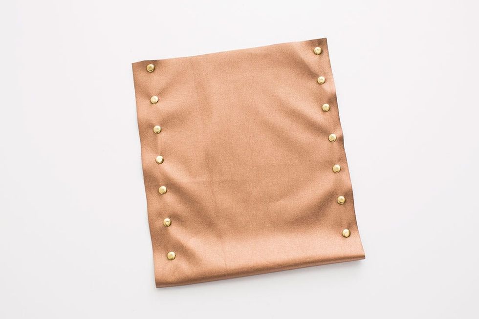 3. Set your rivets along the side of your sleeve to determine the best placement. Then make holes with your awl and stick the male side of the rivets through them.