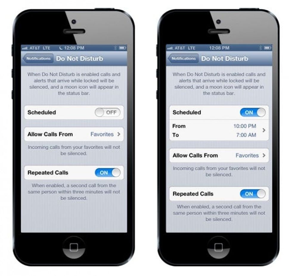 2. Do Not Disturb: This lets you put your phone to sleep, except if you get a text or call from one of the people on your list of Favorites. You can also set a time range so that you don’t have to worry about forgetting to turn it back off. To customize Do Not Disturb, go to Settings and then Notifications.