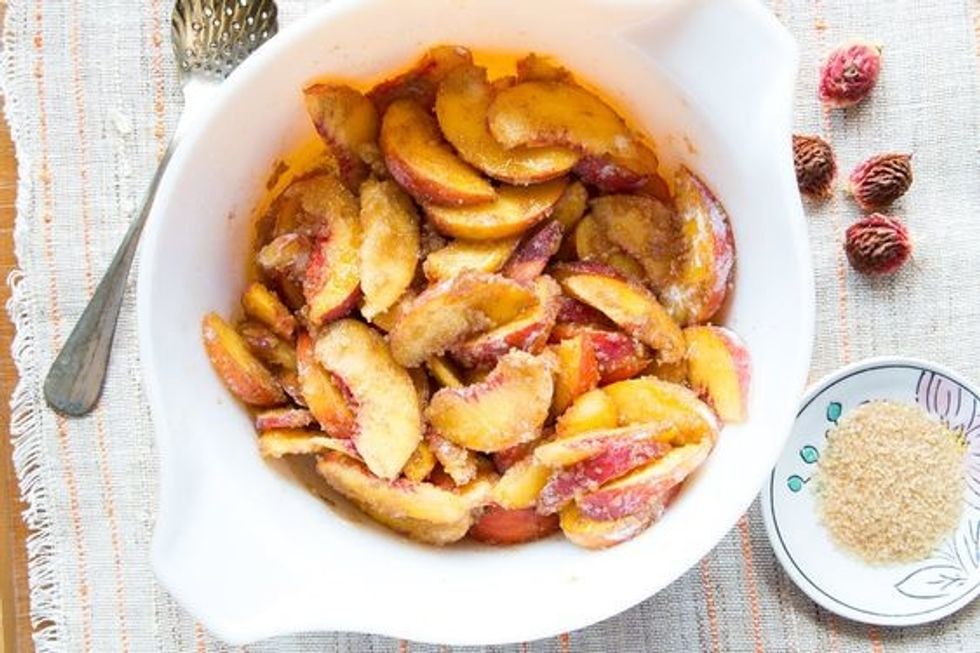 1. Preheat the center of your grill to medium-high heat (400 degrees Fahrenheit). Toss the sliced peaches, brown sugar, flour, cinnamon and vanilla extract together and set aside.