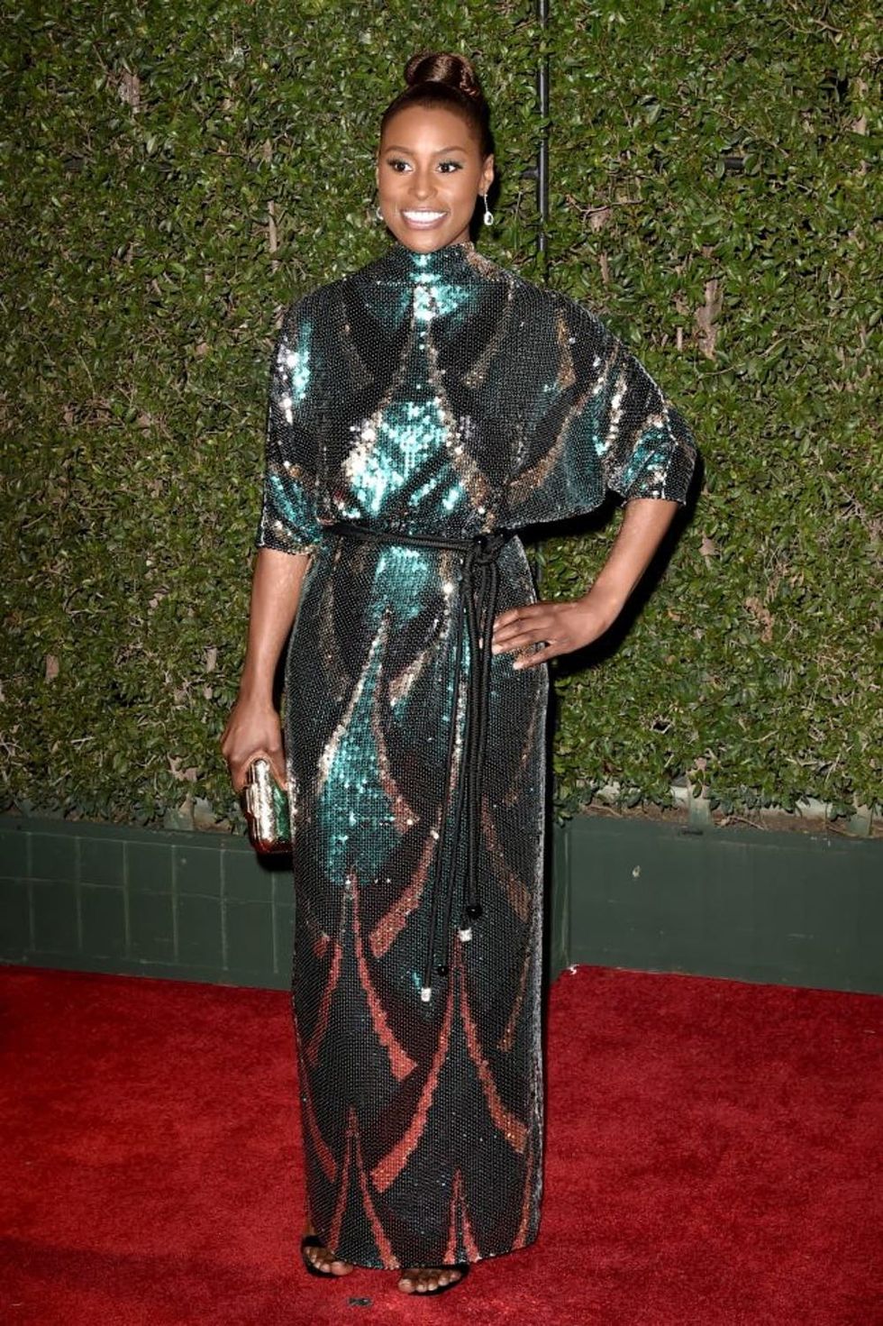 3. Slay without bearing it all. A bit of glitz and glamour are all you need to nail an undeniably OMG-worthy look. Rae keeps things classy with a modest silhouette while delivering plenty of wow-factor with the help of shimmery sequins and sleek accessories. (Photo via David Crotty and Patrick McMullan/Getty)