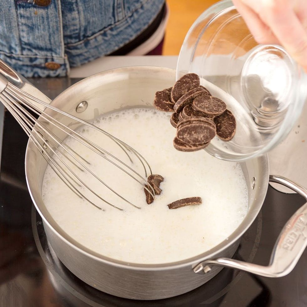 2. Lower the heat to medium then add the chocolate, whisking vigorously until it is completely melted.