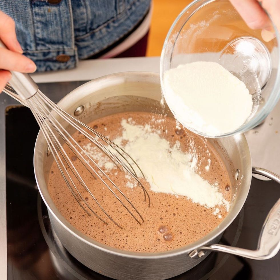 3. Add the milk powder and cornstarch, still whisking, until everything is dissolved and the mixture is smooth and thick.