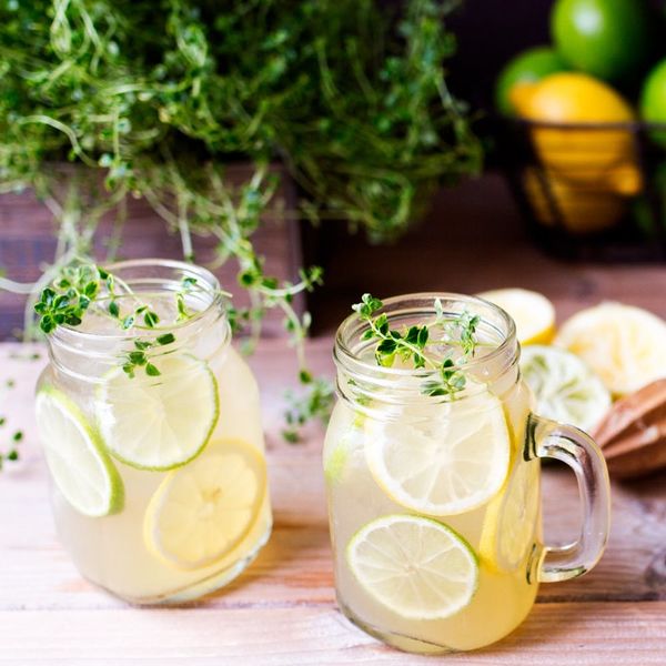 4. Add in slices of lemon and lime, then top with lots of ice. Muddle in a few sprigs of lemon thyme just before serving.