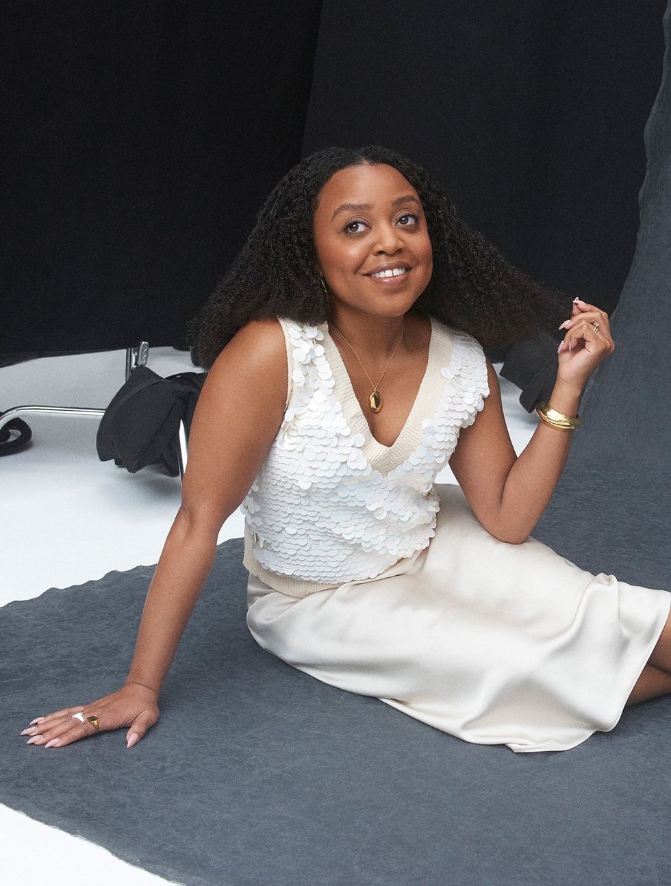 Quinta Brunson, mastermind behind Abbott Elementary, got adorned in a soft, monochromatic outfit to celebrate with J.Crew. Her shell-white top flaunts big sequins, while the silk skirt on the bottom smooths and evens the look out.