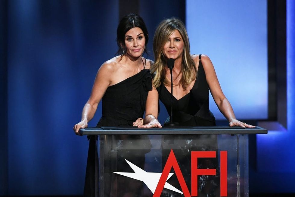 The duo then launched into a bit based on the Friends theme song. “I mean this, in all seriousness, from the bottom of the both of our hearts, I’m going to be there for you,” Aniston said, before Cox piped in, “When the rain starts to pour.” Aniston then reiterated her previous sentiment, telling Clooney, “I’m going to be there for you, buddy,” which paved the way for Cox’s “Like I’ve been there before.”