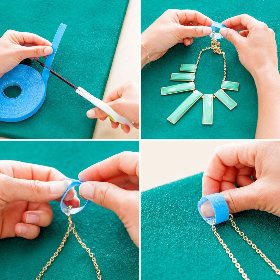 Now, time to get organized. Cut pieces of VELCRO® Brand Tape and loop them to organize necklaces.