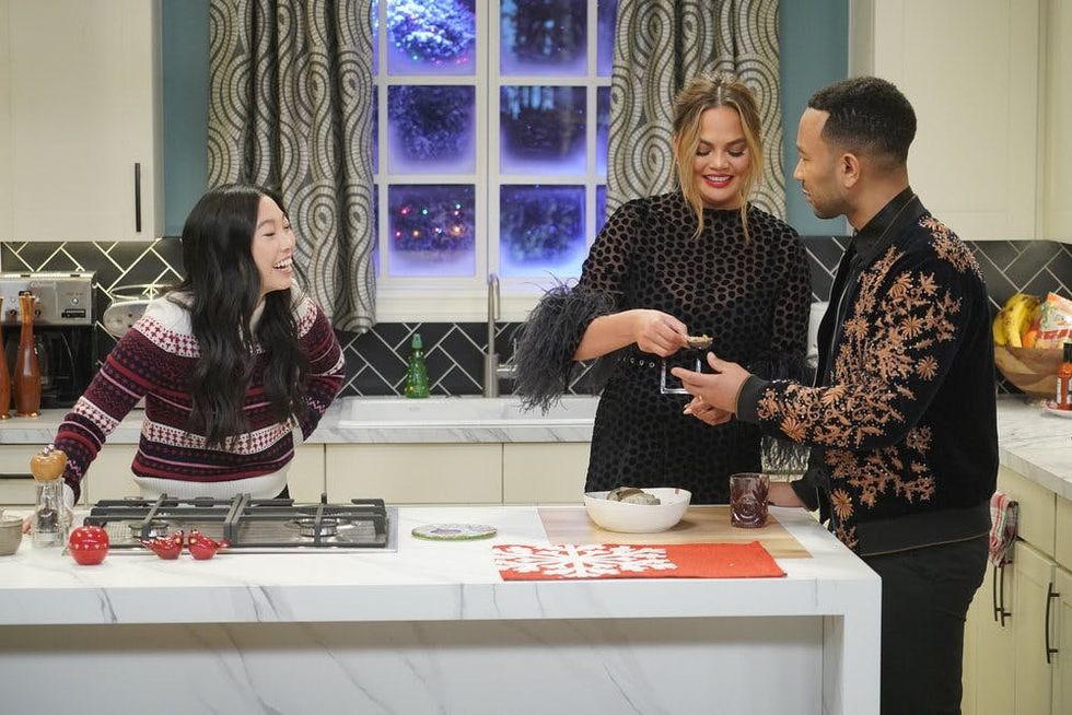 Awkwafina: In one of the most comical kitchen scenes of the night, Awkwafina, inspired by Teigen's recipes, brought Pad Thai Carbonara in Teigen's Target collection bowl. As she does, the rapper and comedian put her own spin on the dish and used a PSL, ranch dressing, and river clams to season the dish, which Legend was forced to taste test. (Photo via Paul Drinkwater/NBC)