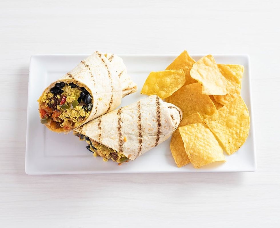 JUST Egg, combined with Veggie Grill’s “chorizo,” home fries, black beans, cheddar “cheese,” and fire-roasted salsa, is wrapped up inside a toasted flour tortilla for a breakfast burrito that, while satisfying, won’t fill you with regret afterward. Dare we admit, many of us ended up eating two!