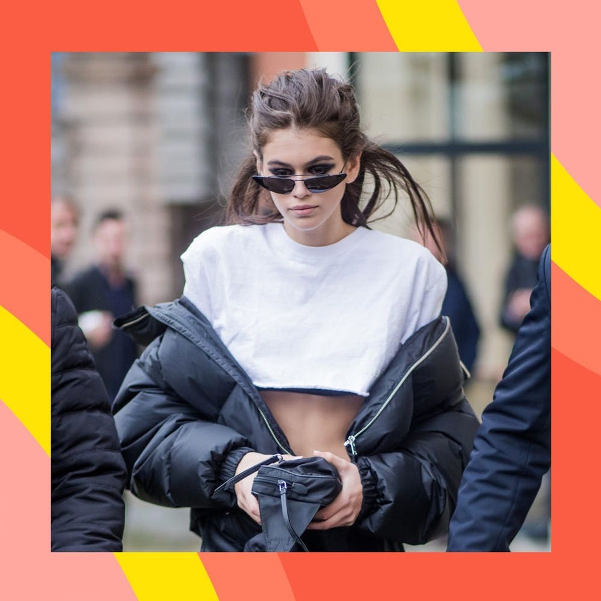 Oh, Crop: We'd never have thought to pair wide leg joggers with a mock neck crop and teeny tiny sunnies, but we're seriously considering adding this combo to our spring-time lineup. (Photo via Christian Vierig/Getty)