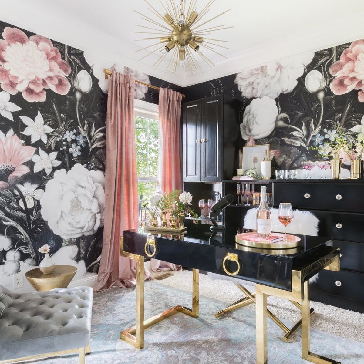 “Kaitlyn uses her office for recording her hilarious podcast, and thus a dramatic, feminine, ‘wine-inspired’ space was what I set out to achieve,” says McCarthy. She struck an instantly statement-making note with the large-scale floral wallpaper, which really kicked off the design process. “When designing a room it’s important to have an anchor that will inspire the rest of the look. It could be a vintage find, a swoon-worthy piece of art, a dramatic light fixture or, in the instance of Kaitlyn’s podcast room, a bold wallpaper,” she says.