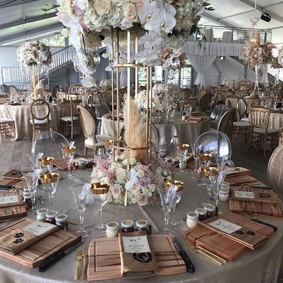 As for the human tables, they also had animal details with napkins embroidered with alternating silhouettes of paw and hoof prints, a nod to the couples’ many pups and horses. The centerpieces included floral towers of roses and orchids, more pampas grass (clearly a theme here), and hanging crystals.
