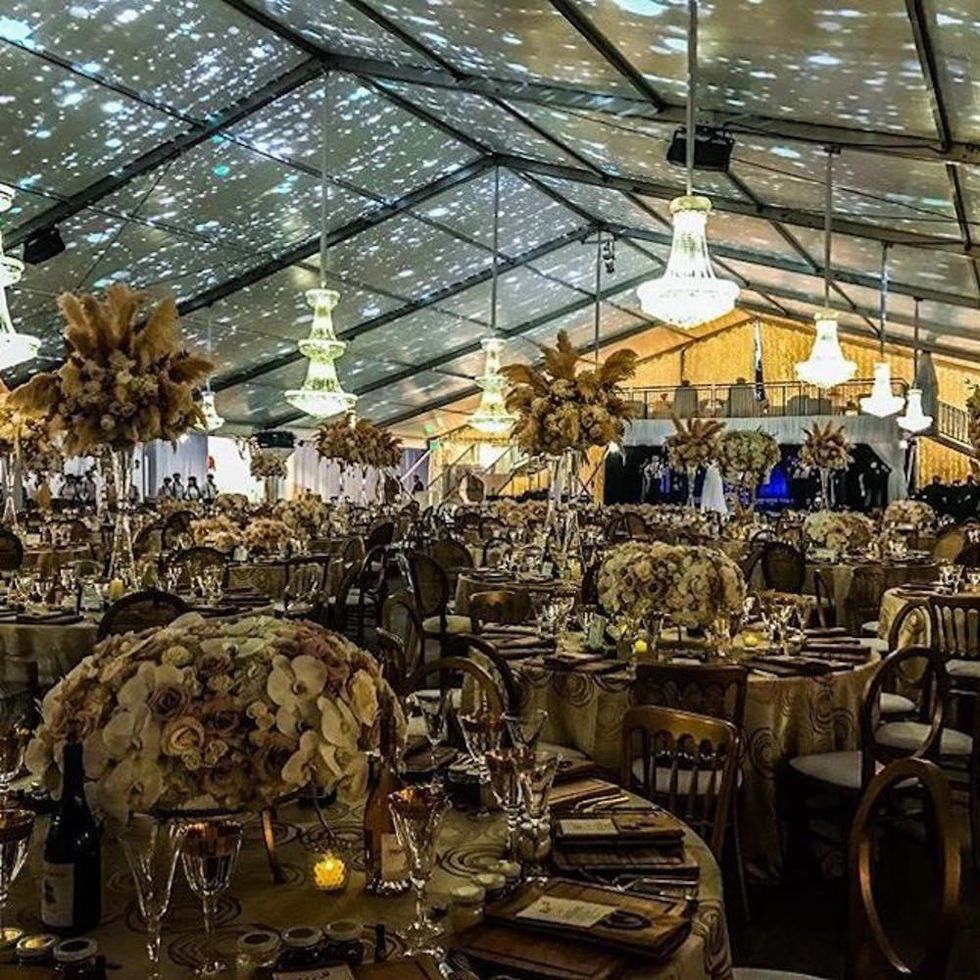Aside from the stunning chandeliers hung from the beams, the tent ceilings were lit to look like the night sky with a starry LED design and even included a projection screen that streamed the father-daughter dance. Aww.