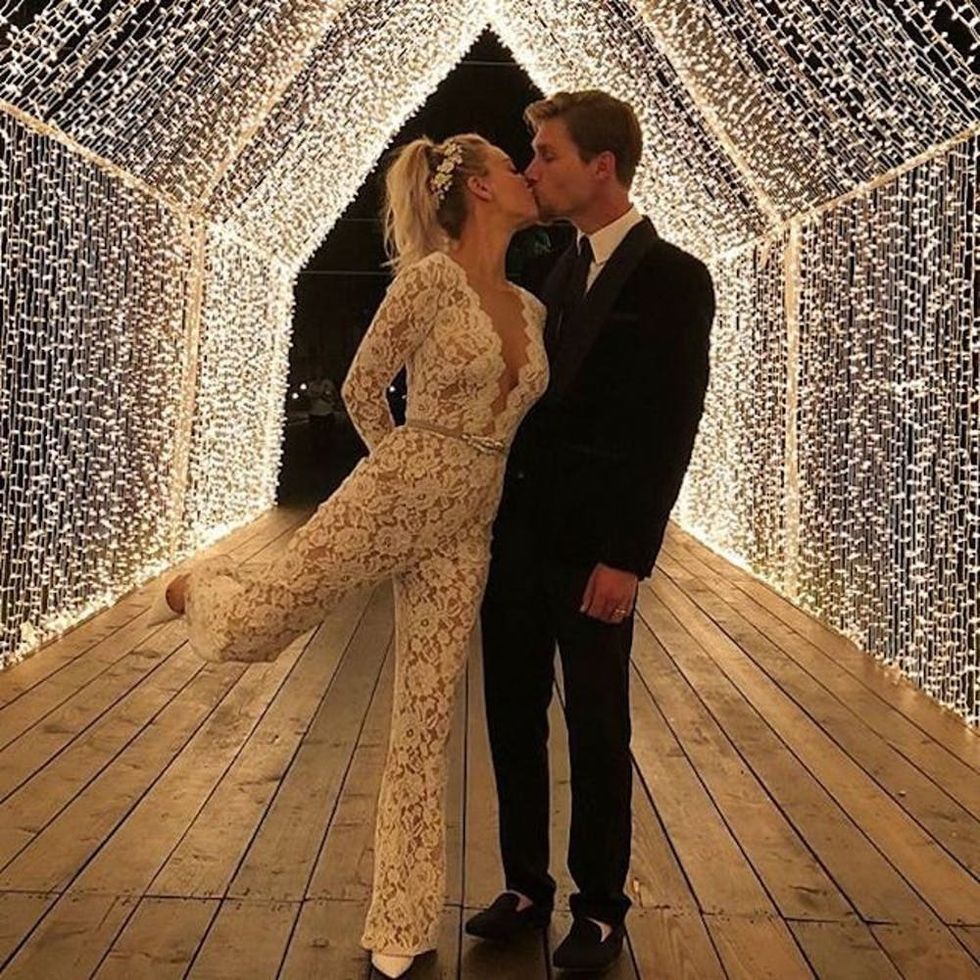 For the party portion of the evening, Cuoco changed into a Tadashi Shoji lace jumpsuit and whipped her hair up into a high pony. The couple shared a kiss under a fairy-lights gazebo that Tatum and her team created for the sweet shot.