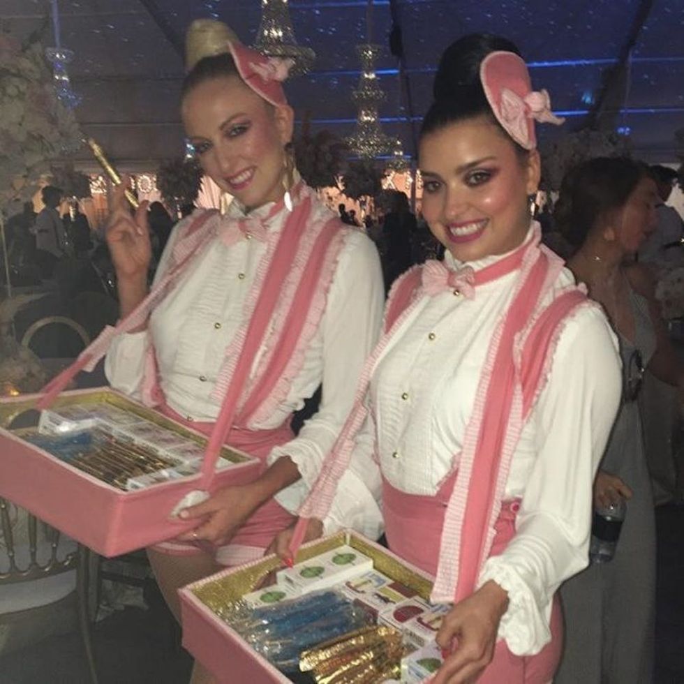 They also had cigarette girls in pink costumes passing out candies and treats (but not real cigarettes). And to really punch up the party, the wedding featured live performers like a fire-breather, a stilts walker, and a juggler. The reception had, as Tatum tells us, “lots of different wines, beers, liquors, desserts, cigar rollers, a spa for women, a barbershop for the men, a fun ice luge that cools the liquor.”