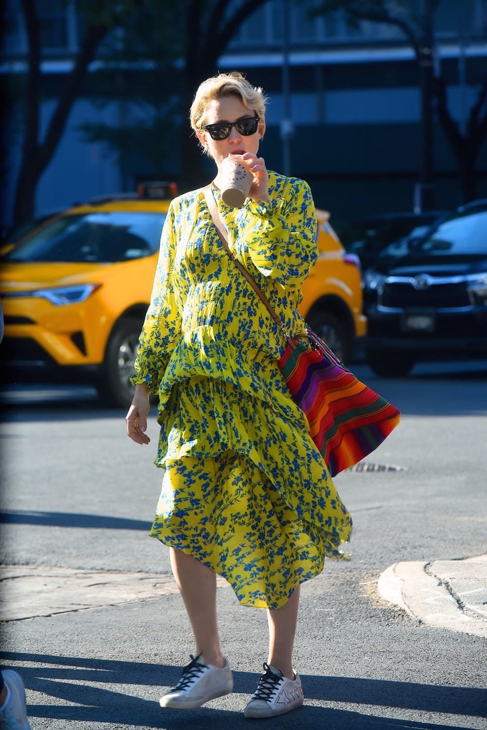 1. Here Comes the Sun: The Marshall actress was a breath of fresh air earlier this week in a bright yellow tiered floral-print Preen Line Eden ($325) frock. She accessorized with an equally colorful tote, a pair of Wayfarer shades, and white Golden Goose Deluxe Brand sneakers with colored laces for a playful touch. (Photo via Robert Gamau/GC/Getty)