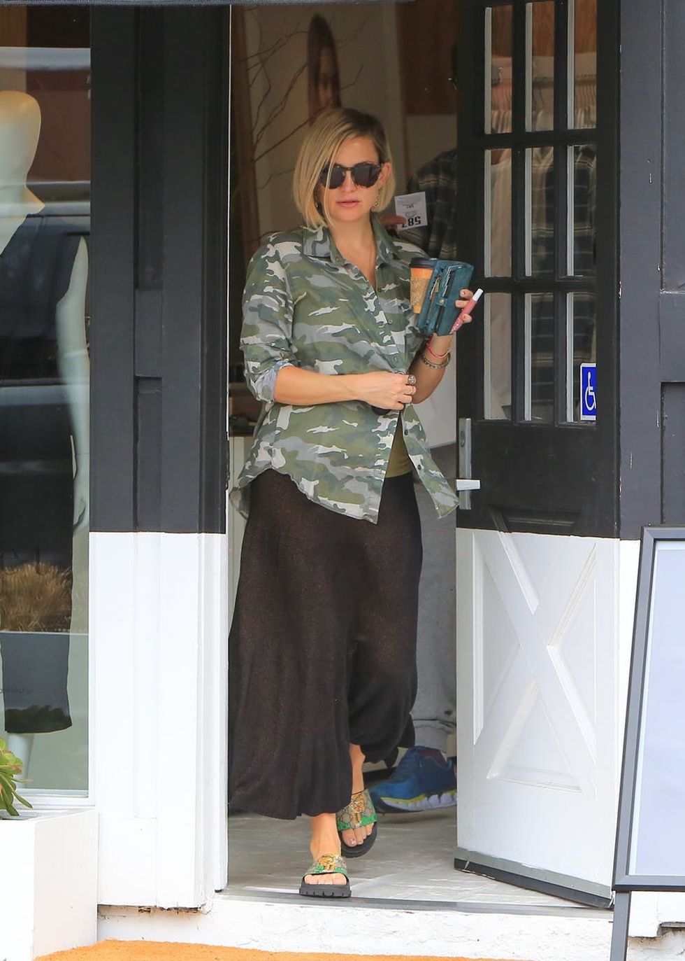 3. Cool in Camo: All eyes were on the 39-year-old as she shopped in LA while wearing a black maxi and green top coupled with her printed camo top. She also showed off a new look in the hair department, flattening her usually-slicked back ‘do into a side-swept bob. (Photo via Bauer-Griffin/GC/Getty)
