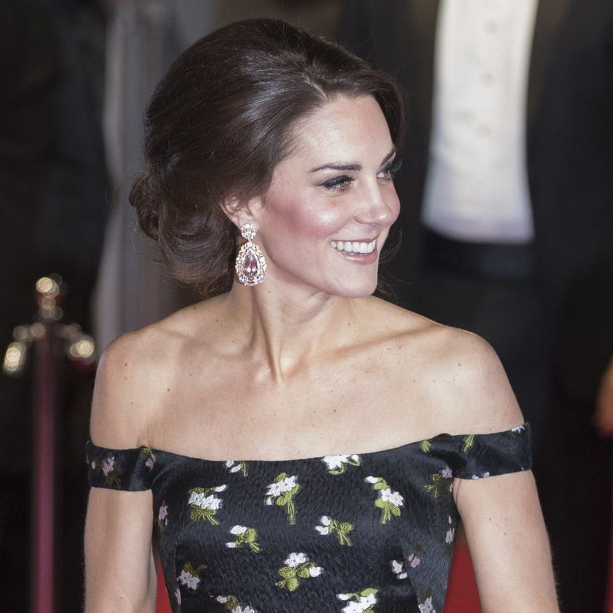 The dramatic floral gown is a variation of one that first appeared in the fashion house’s Spring/Summer 2016 Resort collection. The original featured a corset body and thin spaghetti straps, but Kate Middleton’s bespoke version had a celeb-approved Bardot cut.