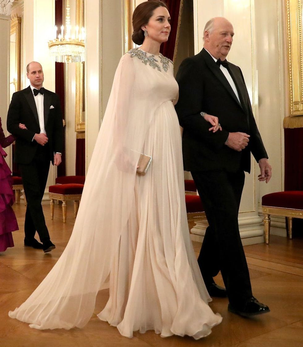 All week long, Kate Middleton has been bringing her fashion A-game while overseas in Switzerland, playing bandy hockey in a pair of cozy (and affordable!) Sorel boots and later channeling her late mother-in-law in an impossibly chic red houndstooth coat. It was the gown she wore while attending an official dinner at the Norwegian palace in Oslo, however, that all but took our breath away.