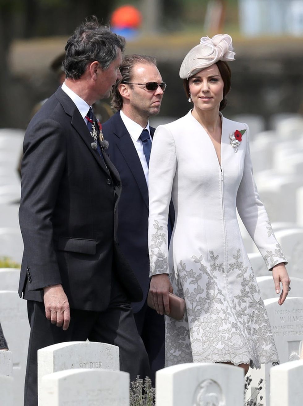 The Duchess of Cambridge looked elegant in a white Catherine Walker “Melrose” coat with silver lace embroidery detailing while attending a ceremony to honor the fallen soldiers of World War I at Tyne Cot Cemetery in Ypres. Middleton kept her accessories to a minimum with beige suede pumps, a small hat with bow detail, a pearl brooch, and dainty pearl drop earrings.