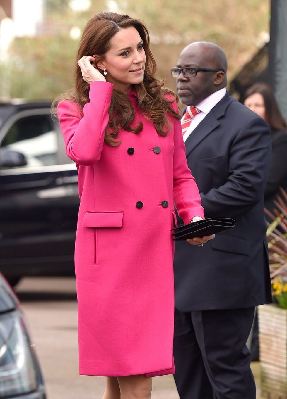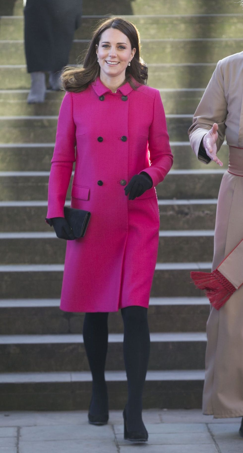 The Duke and Duchess of Cambridge appeared in Coventry yesterday for a day of public appearances, and Middleton’s hot pink 2014 Mulberry coat (approximately $1,085 USD), black gloves and clutch, and favored black Tods pumps instantly stole the spotlight.