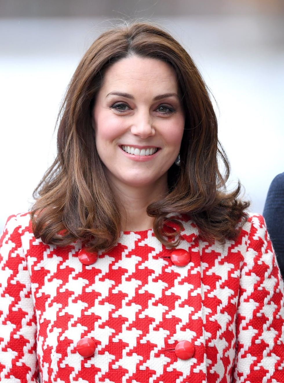 Back in 1990, the late Diana wore a red and white houndstooth jacket by Moschino, pairing it with a black turtleneck and a black and white houndstooth pencil skirt, accessorized with a wide-brimmed felt hat with lace trimming, red and black pumps, sheer black tights, and her signature pearl earrings. So to see the Duchess of Cambridge in a virtually identical coat by Catherine Walker with a 2018 twist is truly the sweetest way for her to sartorially honor Prince William’s beloved mother.