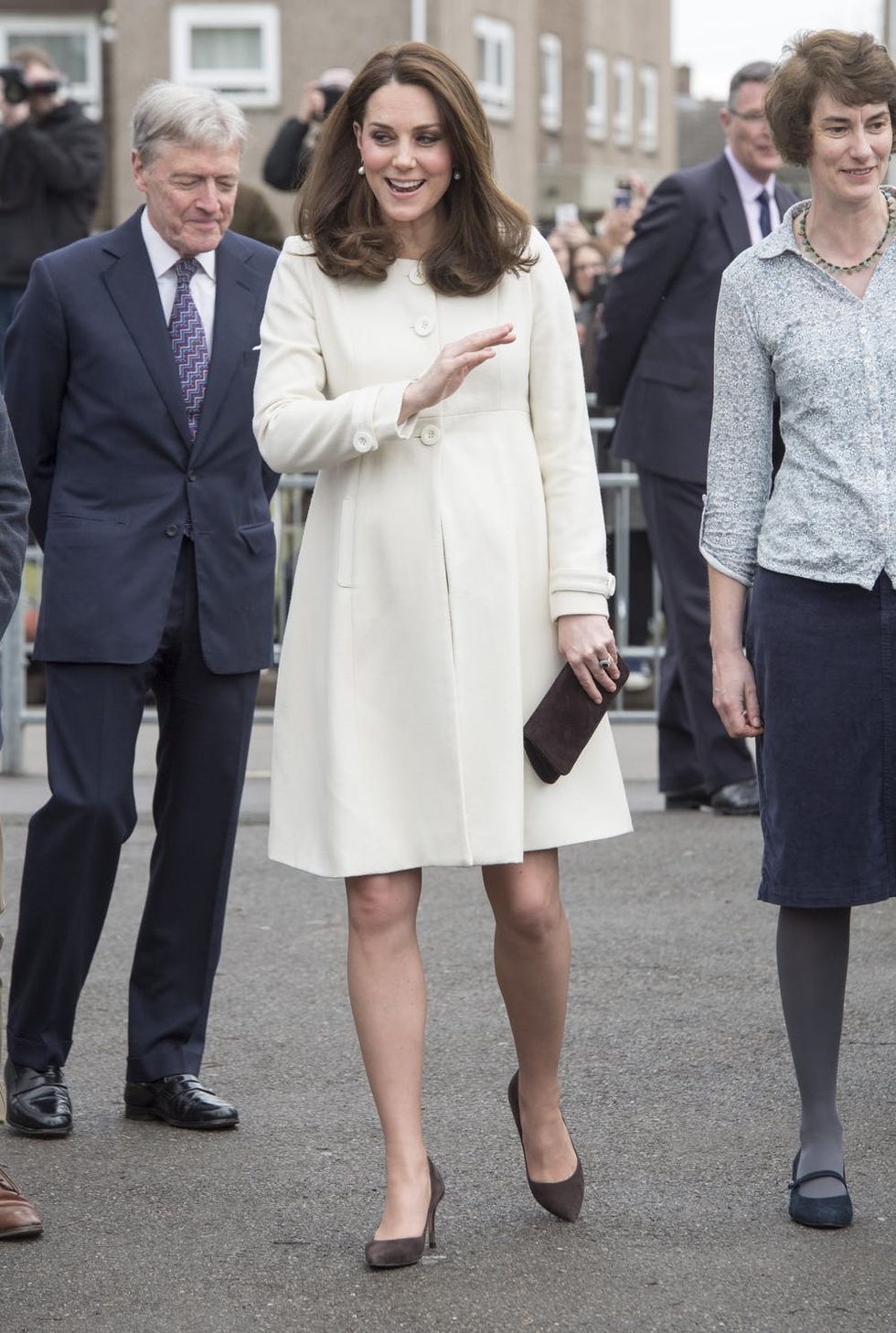 The brunette beauty was spotted stepping out in the aptly named JoJo Maman Bébe Princess Line Maternity Coat ($145) for an appearance at Pegasus Primary School in Oxford, England.
