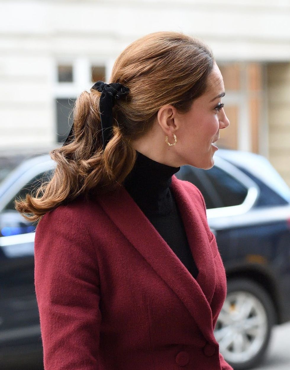 As with many of Middleton’s outfits (like this Jenny Packham Gown), the velvet hair bow was not a one-off. On November 21, while on a solo trip to a UCL Developmental Neuroscience Lab in London, Middleton accessorized her ponytail (this time featuring more curls and less teasing) with a black bow.