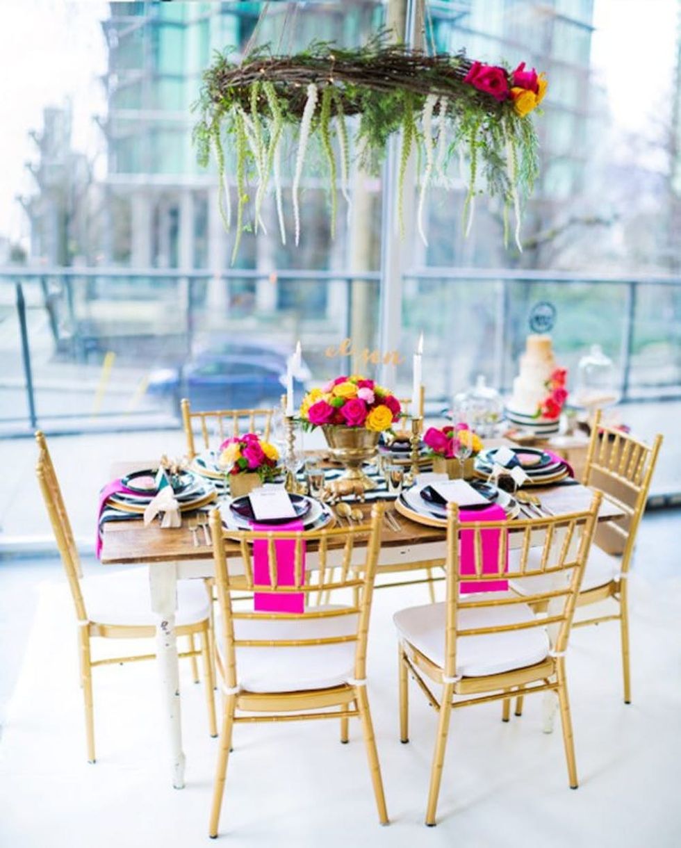 2. Cheery Settings: Transform your table into something that could be on display at a KSNY store. Work with bright linens, patterned plates, and gold vases (filled with fresh florals, obvi) to create a snap-worthy arrangement guests won’t be able to stop staring at. (via Ruffled)