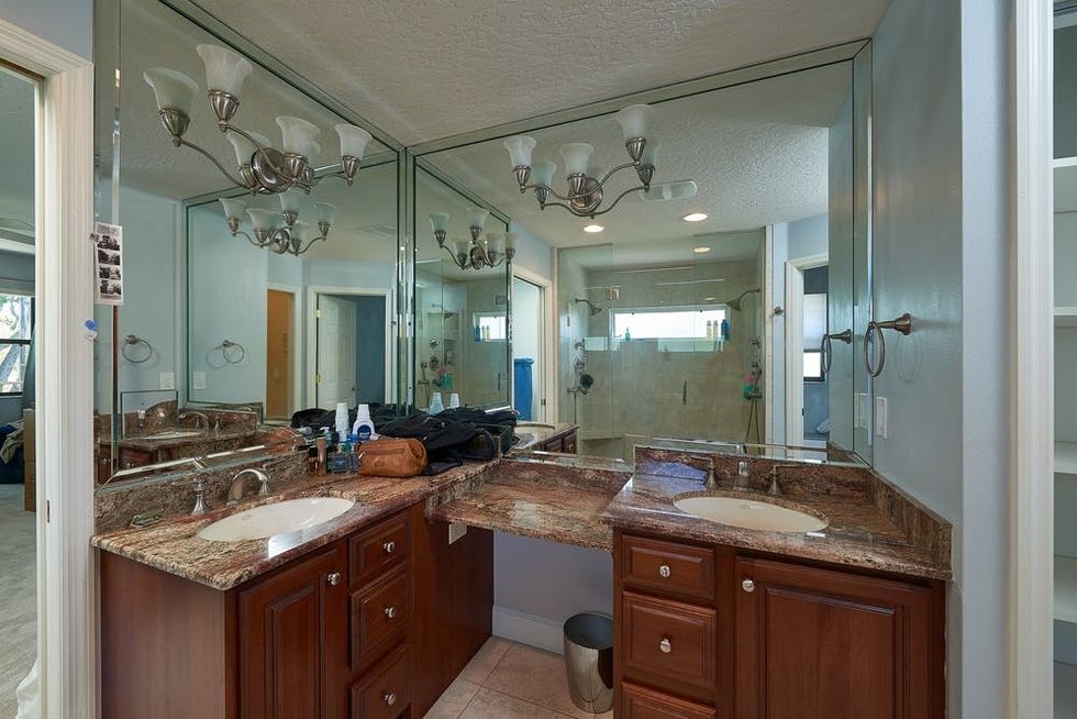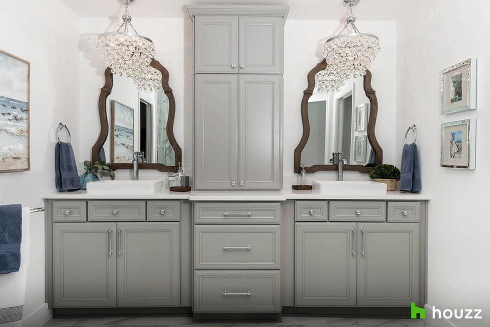 The existing bathroom was dated and poorly organized — not exactly a space that invites the homeowners to linger and focus on self-care. With the help of Motivo, Upton elevated the design to something more befitting her superstar sister and hubby (including his-and-hers chandeliers, of course).