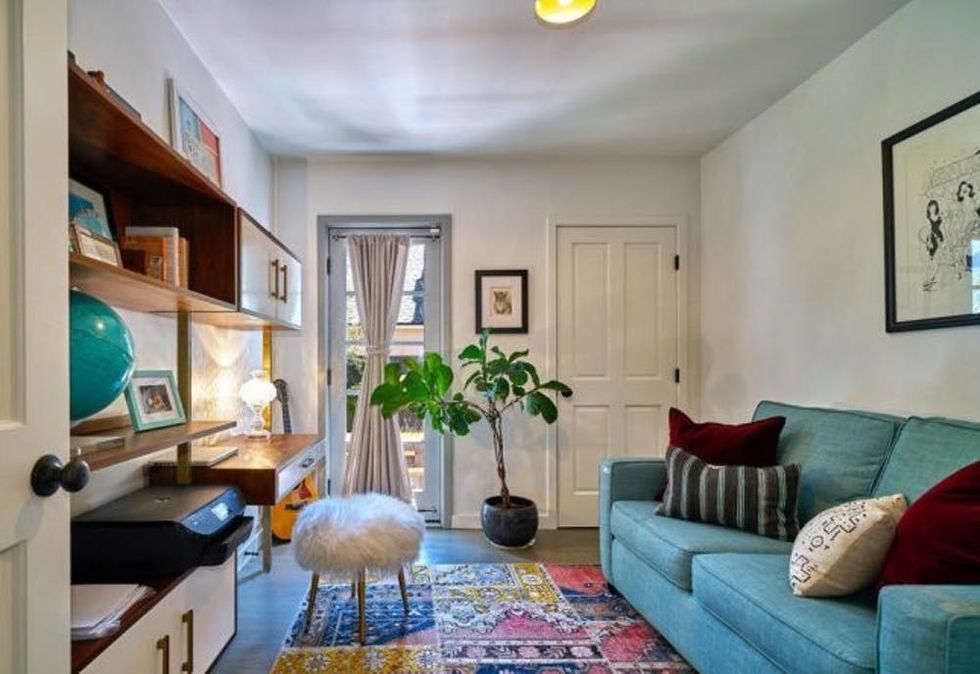 The house may have been built in 1945, but the living room feels *v* modern thanks to blue walls, luxe velvet furniture, and a quirky throw pillow collection. The plush pad boasts three bedrooms and two bathrooms, as well as numerous sets of stylish French doors opening out into the private yard.