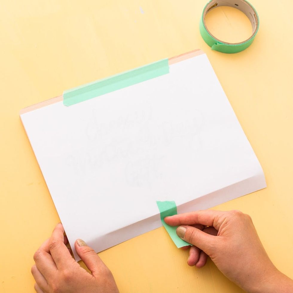 Use an ink jet printer to print out one of our designs. It’s important to use an ink jet printer so that your design will transfer properly. Center your printable on top of the cheese board and tape it down to keep it in place.