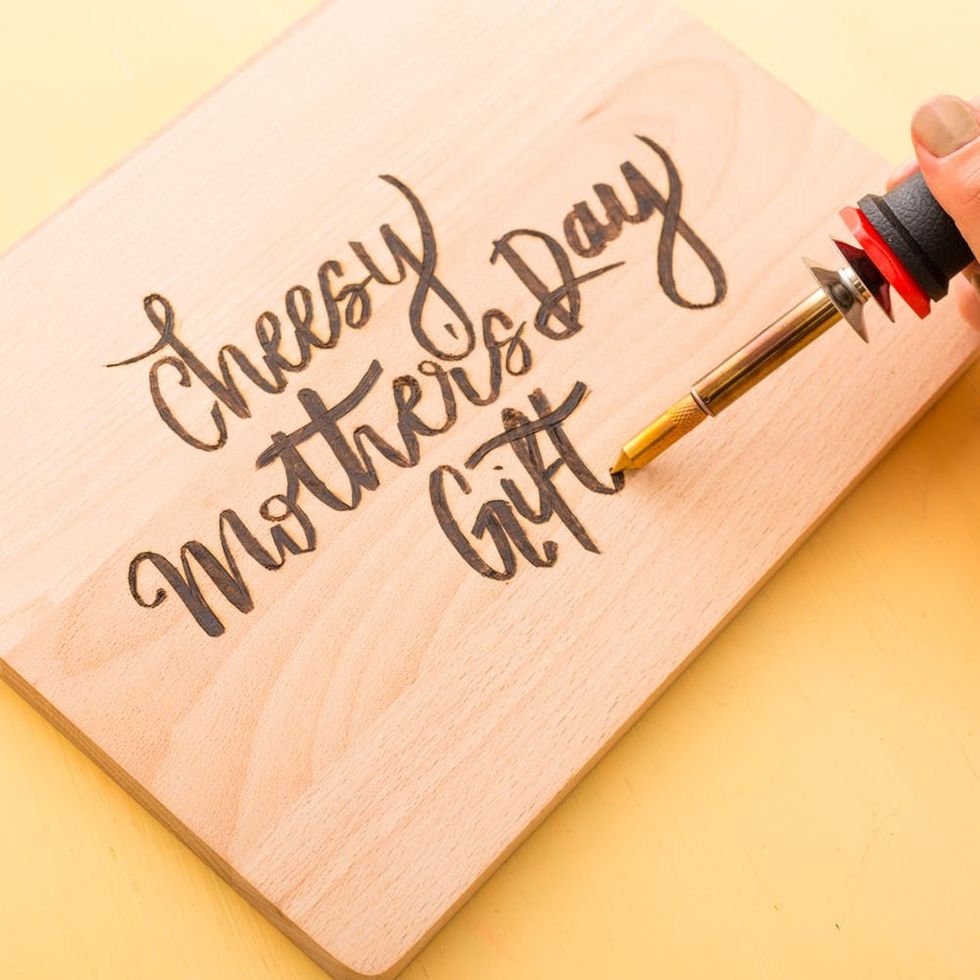 It’s that time of year again, y’all. I’m talking about the few weeks before Mother’s Day, when you’re completely consumed by the anxiety of searching for the *perfect* present for mom. Whether you’re figuring out how to top last year’s gift, or you haven’t quite nailed the art of gift-giving in your 20 some-odd years, this cheese board is the perfect, cheesy present for your favorite lady in your life. We’ll show you an awesome trick to transfer any design onto your board, so pick up a Wood Burning Cutting Board Kit from Target.com and print out a few of our free printable designs!