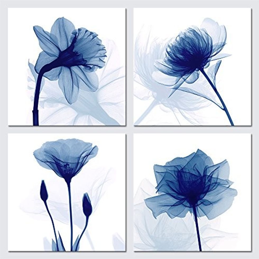 These four-panel blue floral prints are sure to make a statement in any room. With their transparent design and canvas print, you'll feel like you have your own personal art gallery in your home. According to Reyne Hirsch, a former Antiques Roadshow appraiser and gallery owner, these prints are perfect for creating a calming atmosphere in your bedroom.