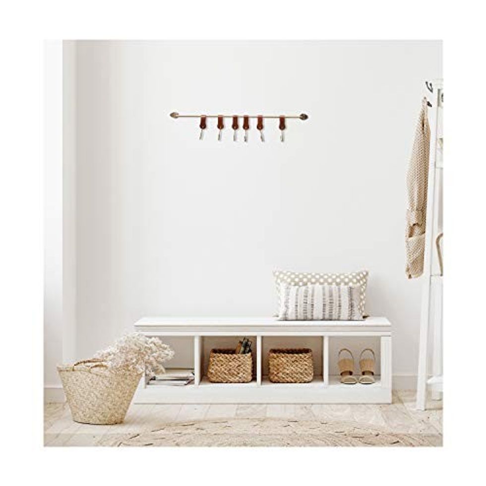 See it on AmazonThese Wall Hooks Made Of Faux Cognac Leather & Gold Metal