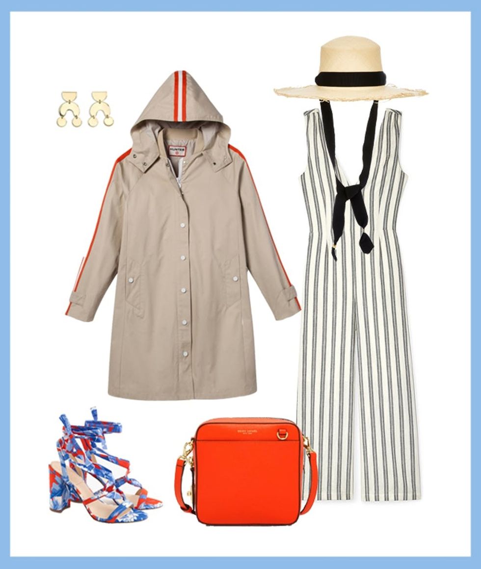 Clockwise from top left: Modern Weaving Tiny Moon Dancer Earrings ($120), Hunter x Target Hooded Trench Coat in Khaki ($45), Sensi Studio Frayed Woven Straw Boater Hat With Adjustable Band ($195), Rebecca Minkoff Marley Jumpsuit ($228), Henri Bendel West 57th Square Crossbody ($198), J.Crew Wrap-Around Heels in Ratti Rio Floral ($248)