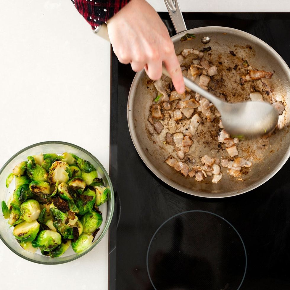 Garnish the Brussels sprouts with the reserved bacon. Serve immediately.