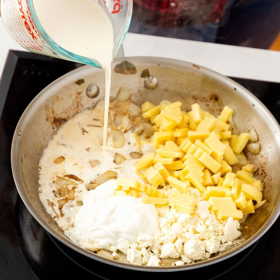 Add the heavy cream, sour cream, gouda, mozzarella, and feta; stir to combine. Reduce heat to medium-low once cheese melts.